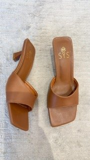 O calçado tem salto taça médio e ponta quadrada  . Traz tira única sobre os dedos e que cobre as laterais. Exibe parte do pé.