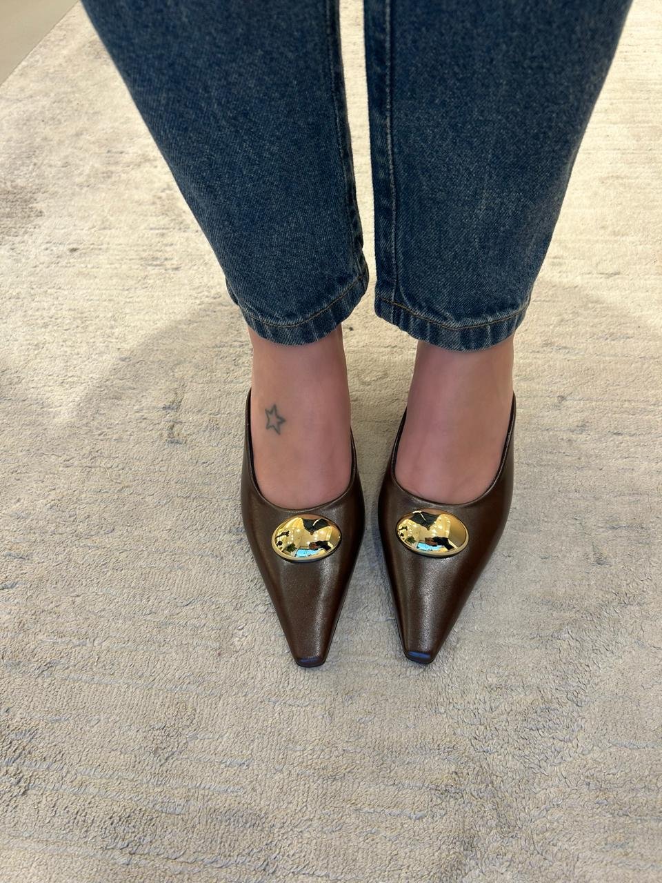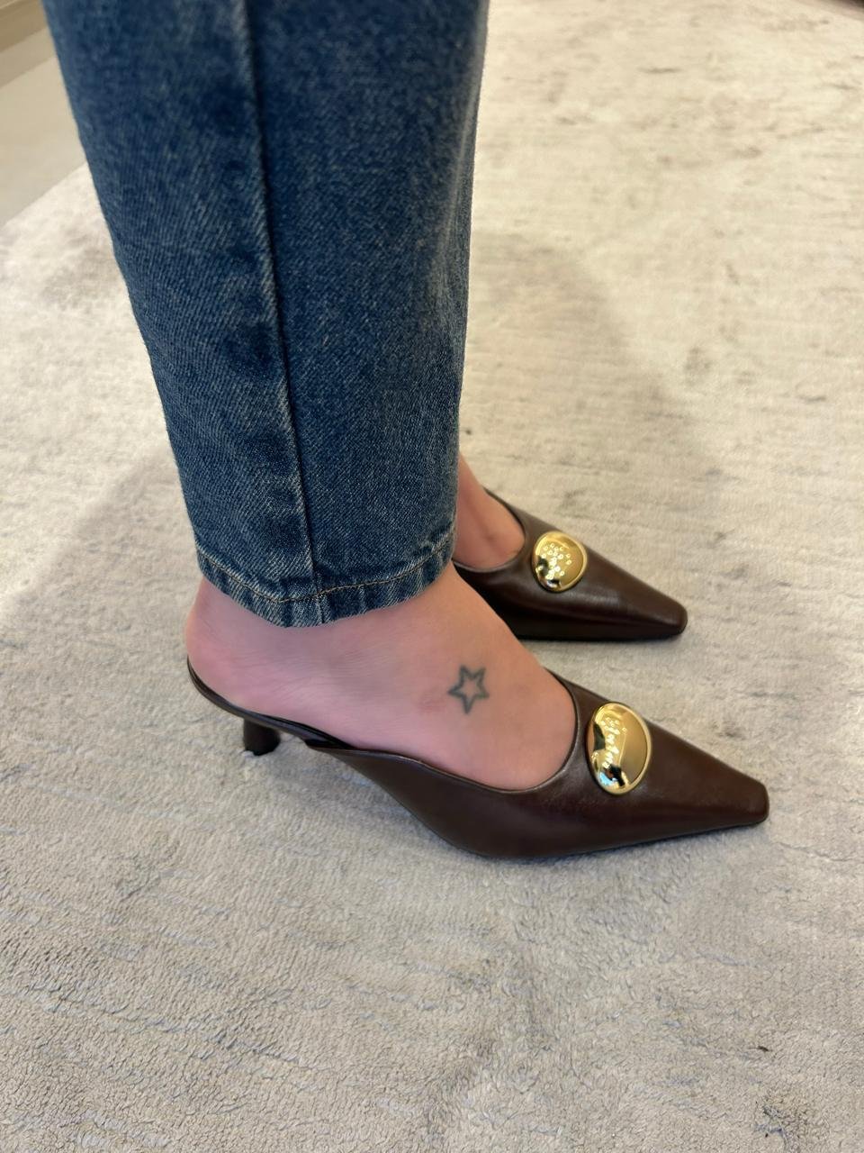Está mule de salto, possui peça orgânica dourada no cabedal, trazendo um toque único ao visual. Confortável e versátil, é a escolha perfeita para complementar looks sofisticados