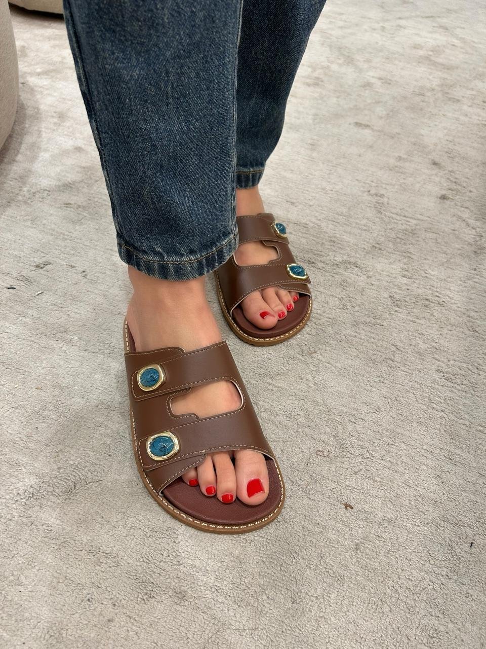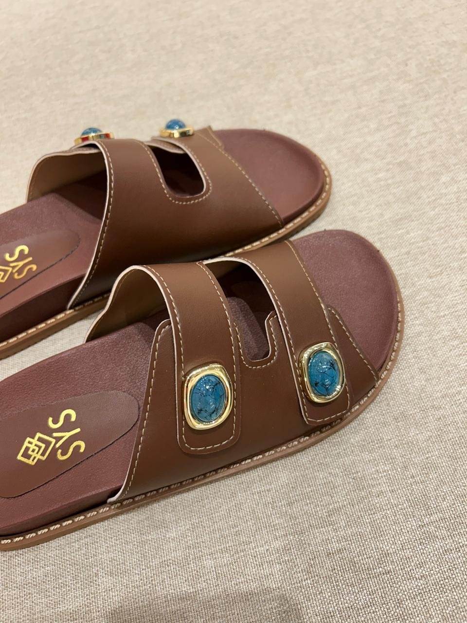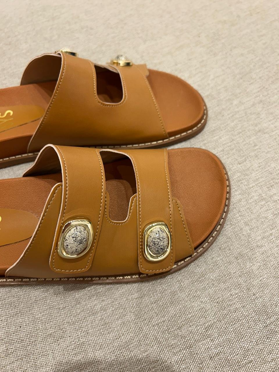 Papete feminina no material sintético, com salto rasteiro , formato arredondado na ponta e detalhes de pedras no cabedal,ideal pra quem gosta de estilo e conforto.