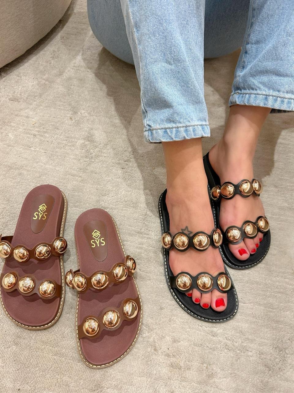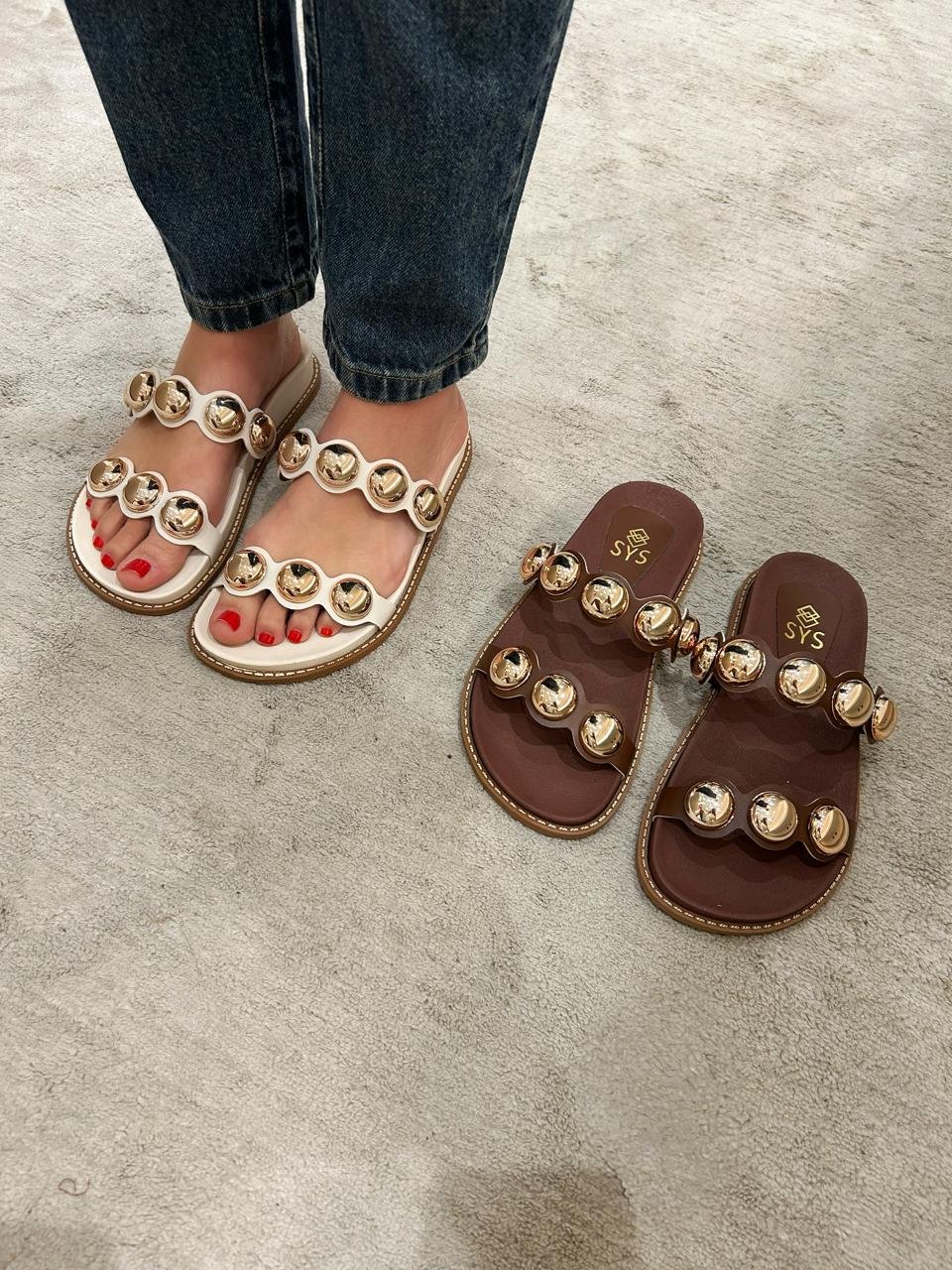Papete feminina no material sintético, tem o salto rasteiro, formato arredondado na ponta e detalhes de esferas no cabedal,linda e confortavel,te dando a liberdade de combinar estilos desde clássicos a mais despojados.