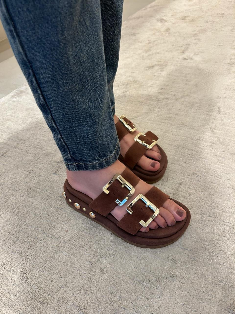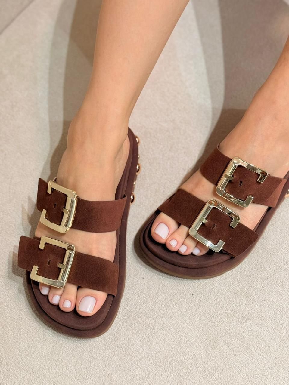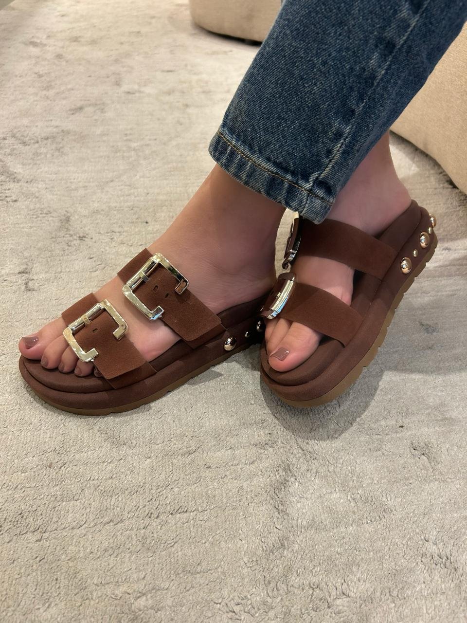 Papete no material camurça, com detalhes em tachas na lateral, e com detalhes em fivela no cabedal, pratica e estilosa, ideal para compor look casuais