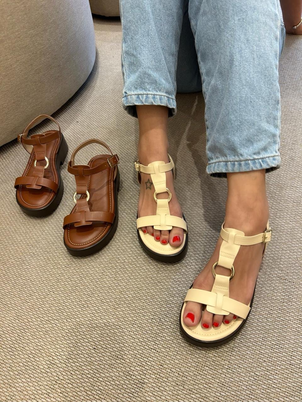 Essa plataforma é uma sandália super estilosa e confortável,, perfeita para quem busca um look moderno e elegante, ela possui uma tira de amarração no tornozelo com fivela dourada, que da um toque sofisticado, com duas tiras largas na frente com uma argola dourada no meio , que além de estética, proporciona segurança e ajuste perfeito ao pé !