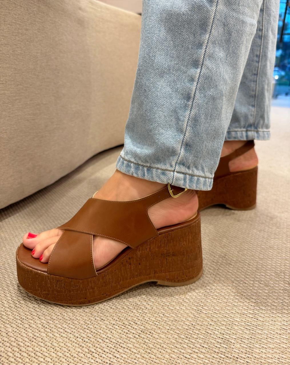 Essa plataforma é um sapato de salto médio, possui duas tiras cruzadas na frente, que da um visual moderno e sofisticado, e uma tira com fivela na parte de trás do tornozelo para um ajuste seguro, o salto por ser plataforma proporciona conforto e estabilidade, o design é versátil ideal para usar com roupas casuais ou mais formais, trazendo um toque de elegância ao seu look!