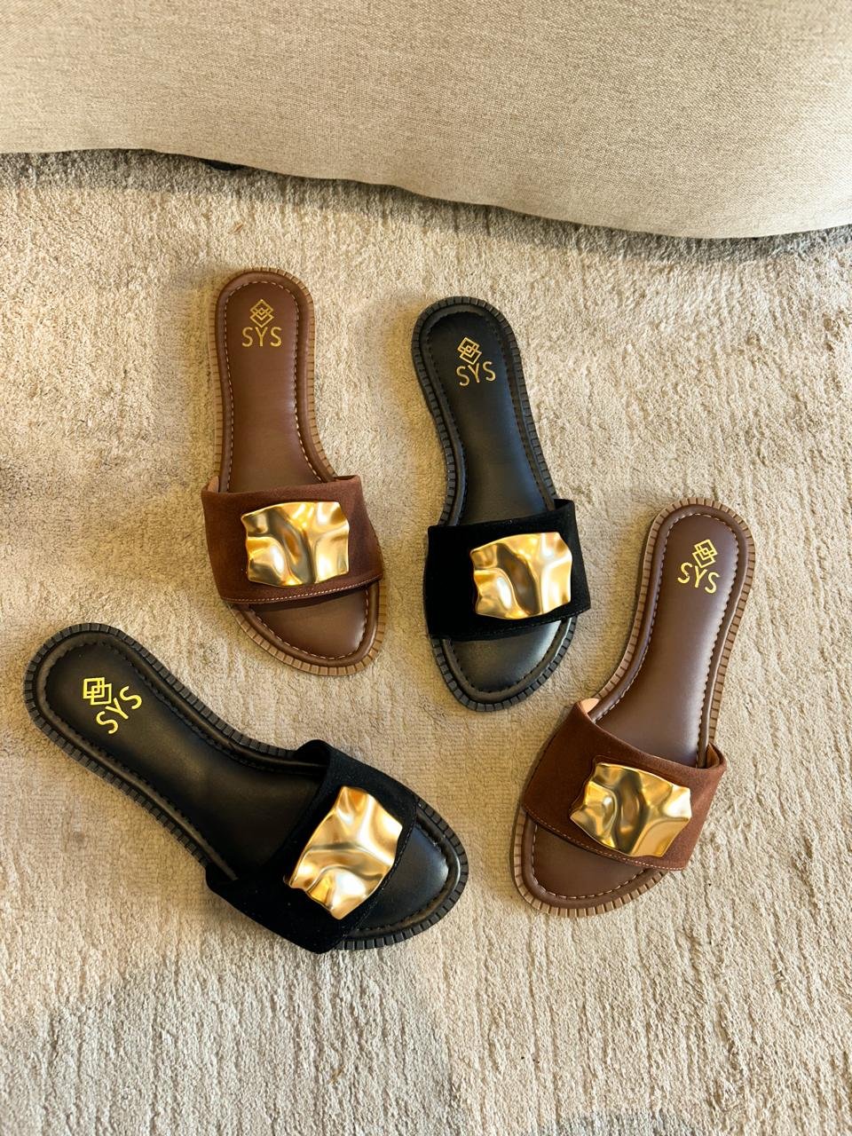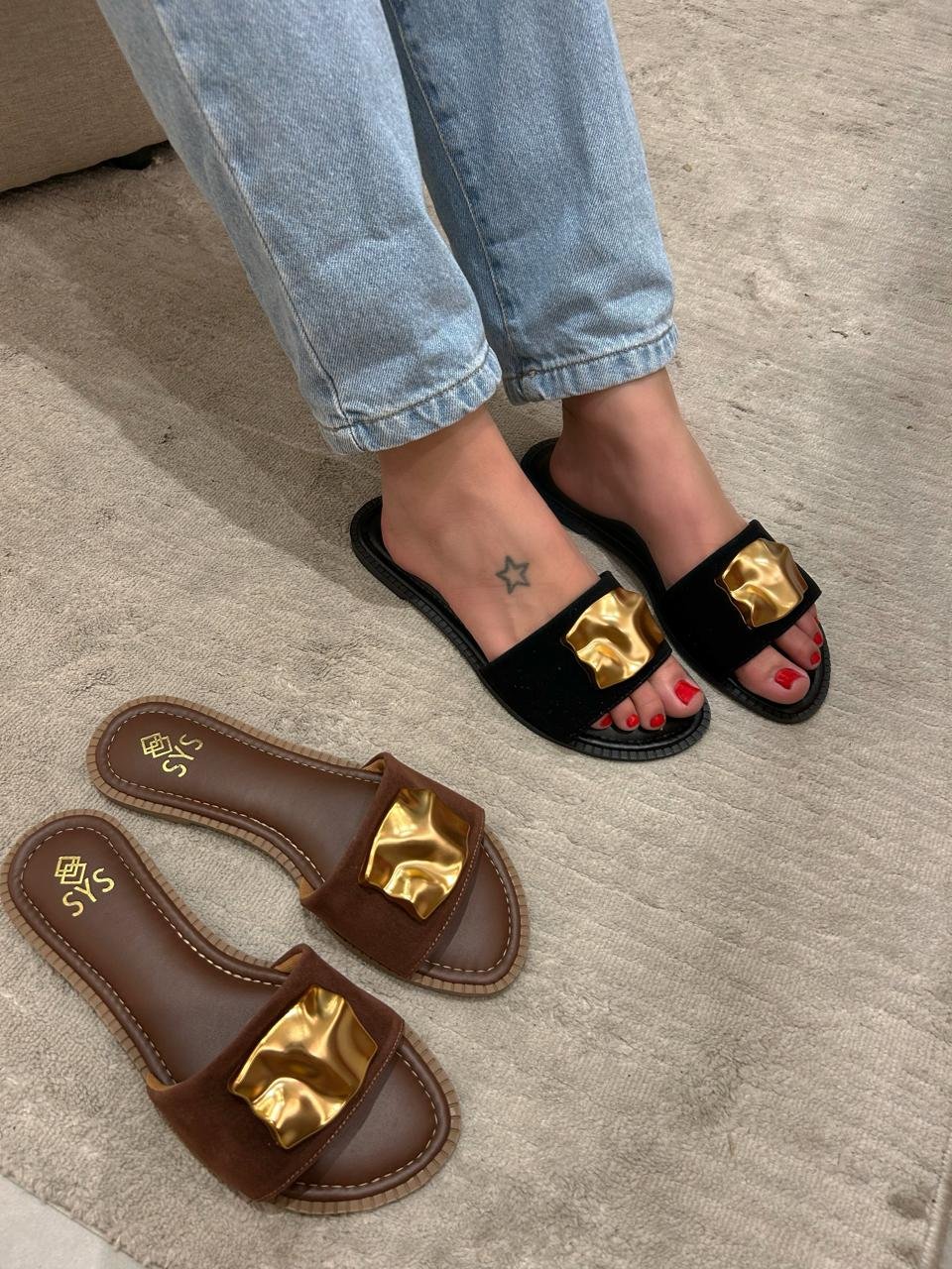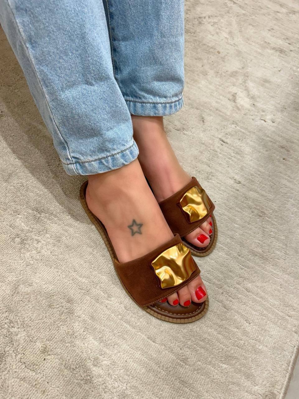 Rasteira com o cabedal em camurça e com peça orgânica dourada, possui uma palmilha acolchoada, proporcionando conforto e estilo.