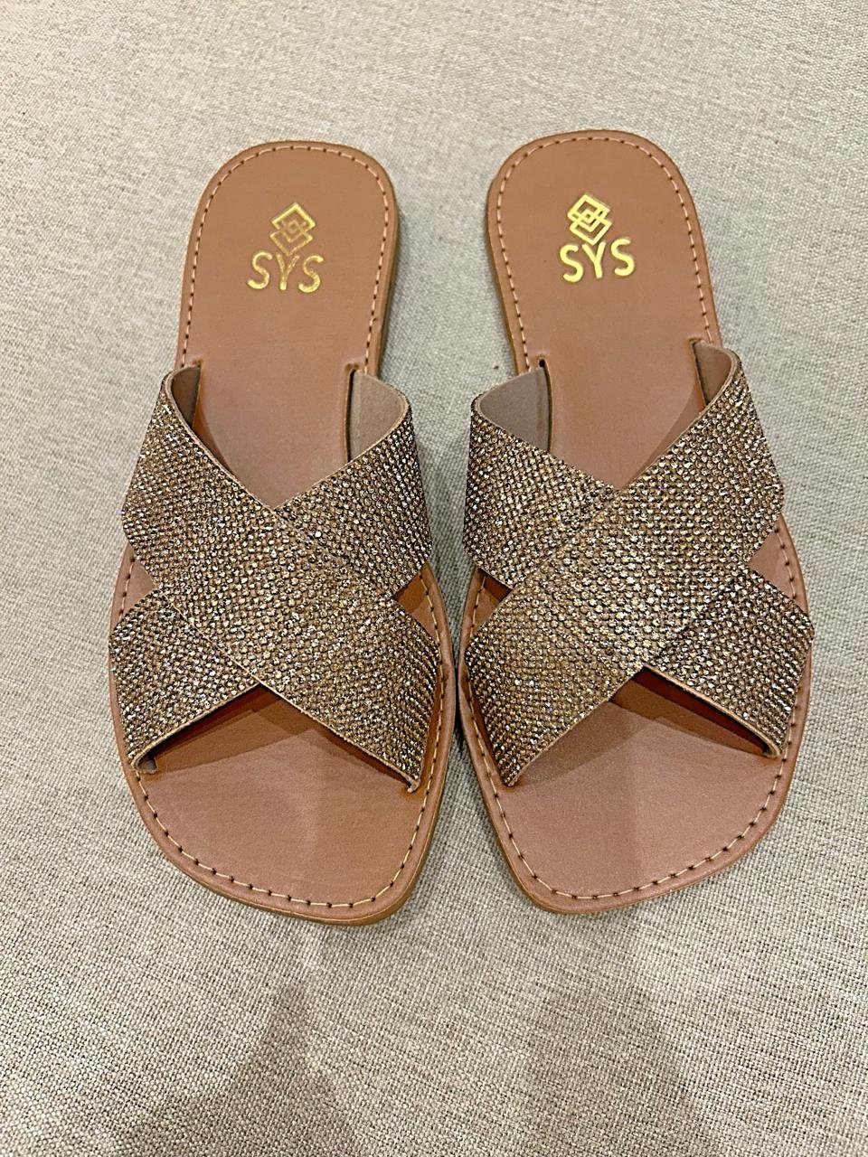 Rasteira com detalhes em strass no cabedal, confortável e prática, uma ótima escolha nesse verão