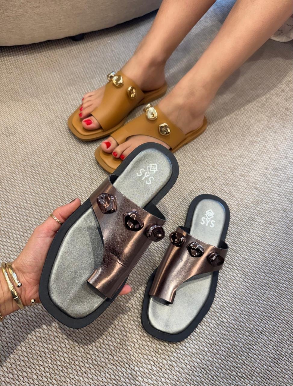 Essa sandália é uma verdadeira preciosidade! É uma peça super elegante e confortável, perfeita para qualquer ocasião,  ela tem uma tira única que passa pelo pé, adornada com três detalhes em metal dourado em forma de pedras, que dão um toque de glamour ao calçado, essa sandália é ideal para quem busca conforto e elegância ao mesmo tempo. É uma peça que vai valorizar qualquer look, seja para um dia casual ou para uma ocasião especial.
