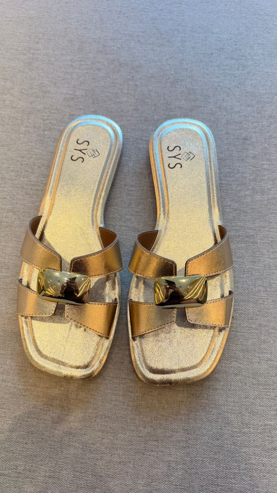 Essa rasteira é super confortável e estilosa, possui o solado acolchoado e tiras largas que cruzam o pé, com um detalhe dourado no meio, criando um visual clean e despojado, perfeito para quem busca um look casual e elegante ao mesmo tempo!