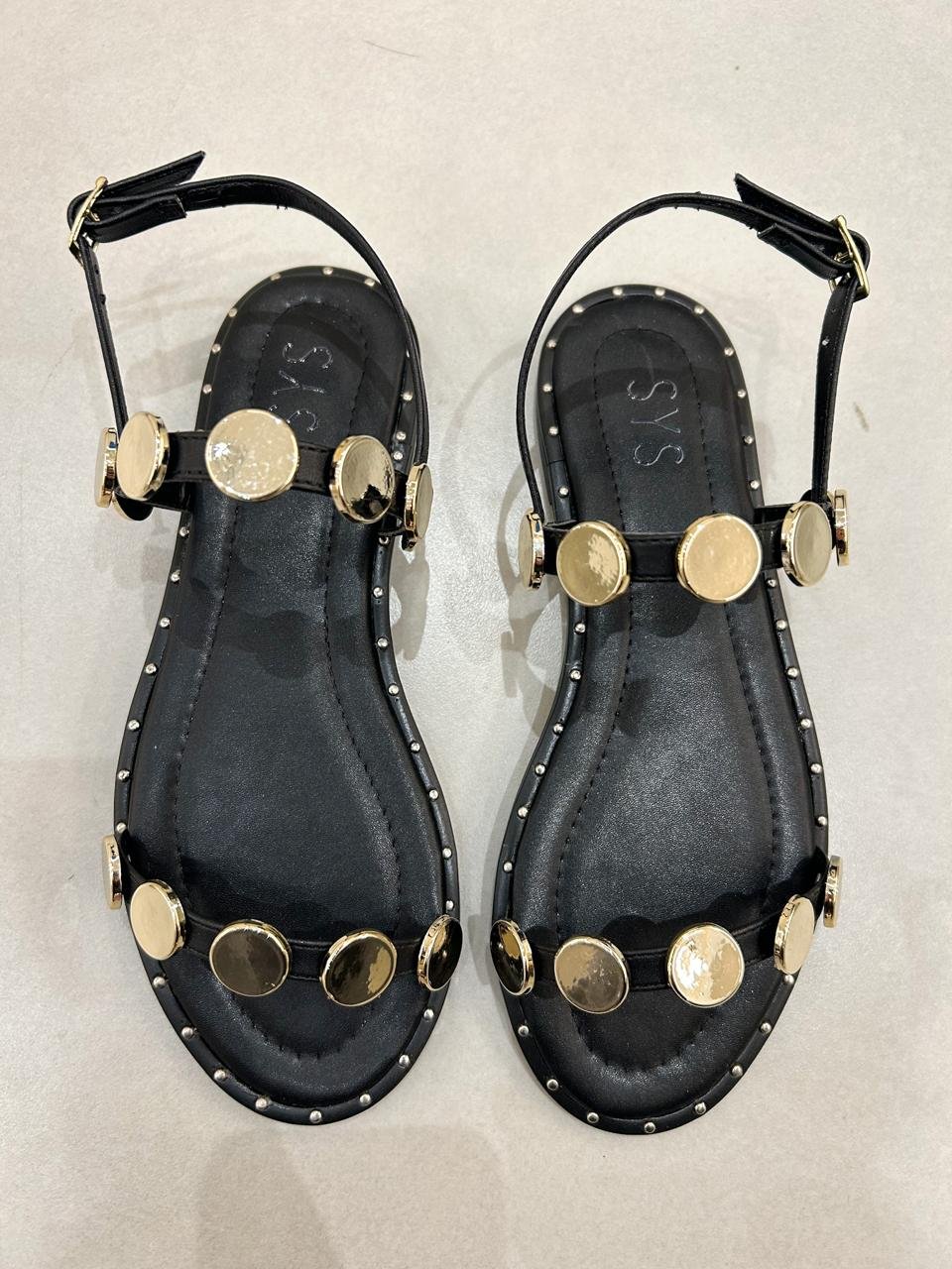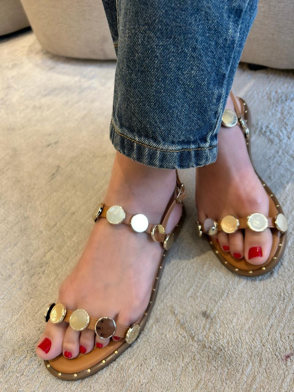 Sandalia rasteira com medalhas douradas no cabedal, trazendo delicadeza e sofisticação ao look, corfortavel e elegante!