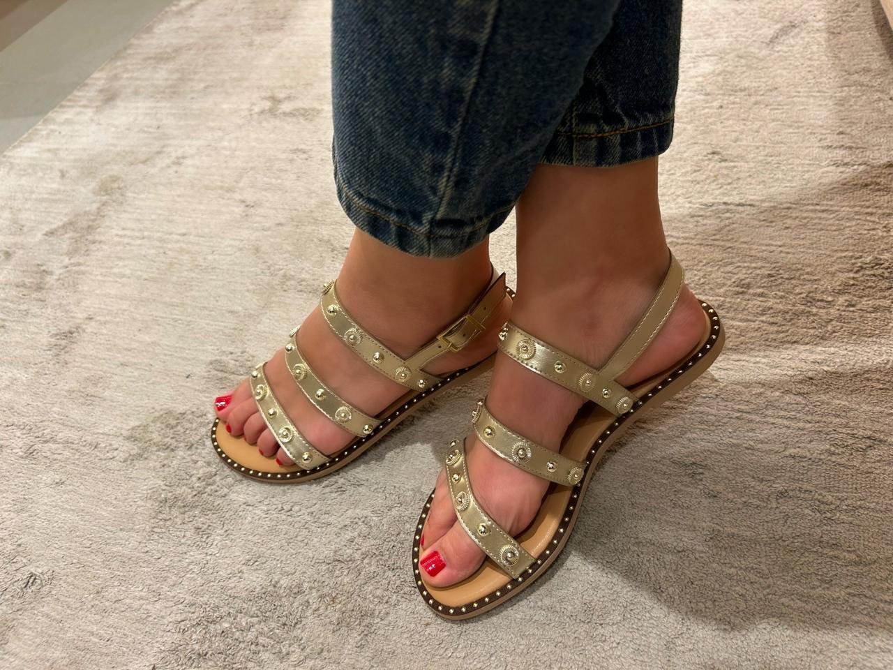 Sandalia rasteira com tachas no cabedal, elegante e versatil, trazendo conforto e segurança