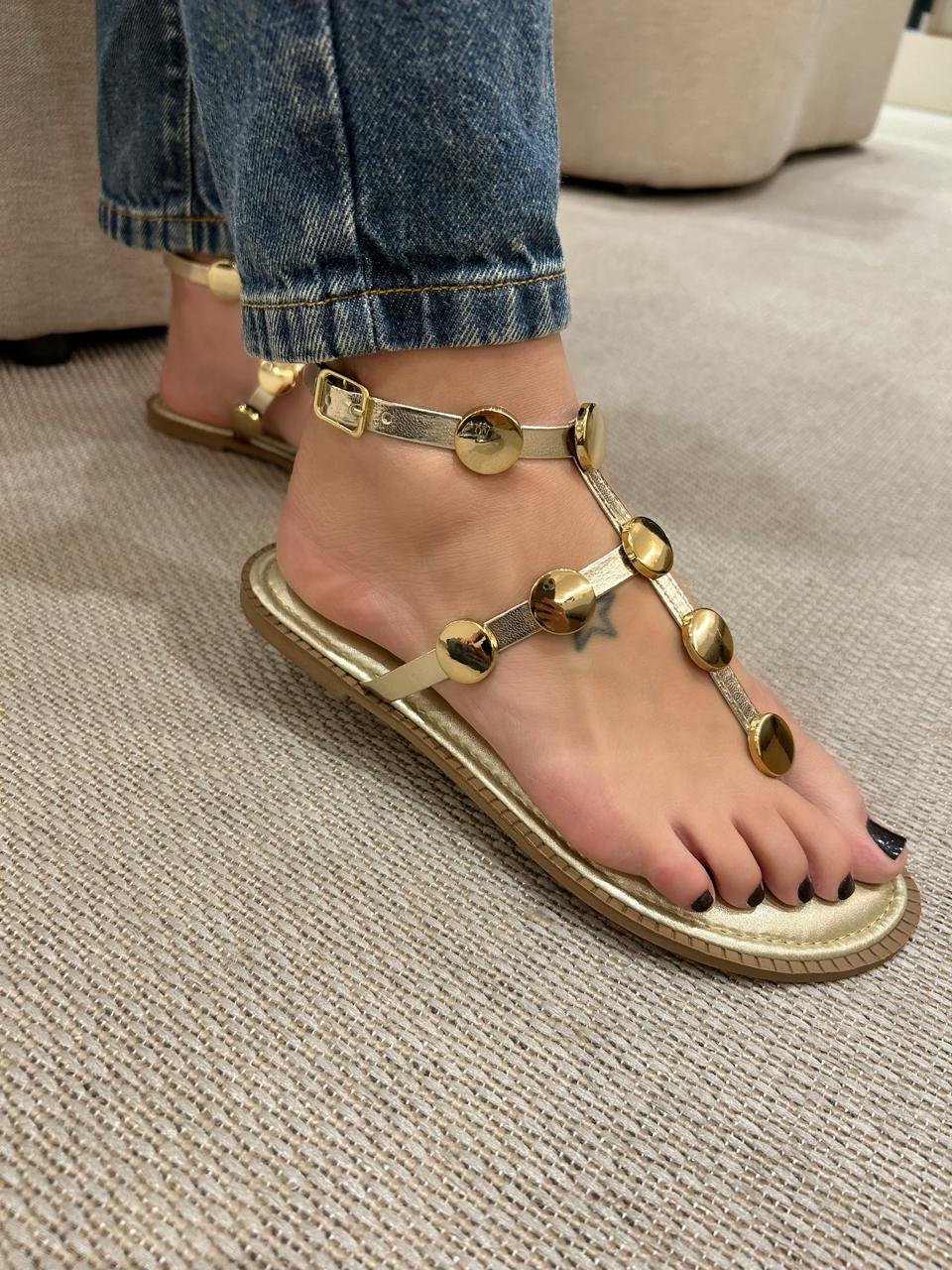 Sandália rasteira com medalhas por todo o cabedal, com tiras finas que prendem no calcanhar e solado acolchoado, trazendo conforto e segurança para o dia a dia, ótima escolha para esse verão!