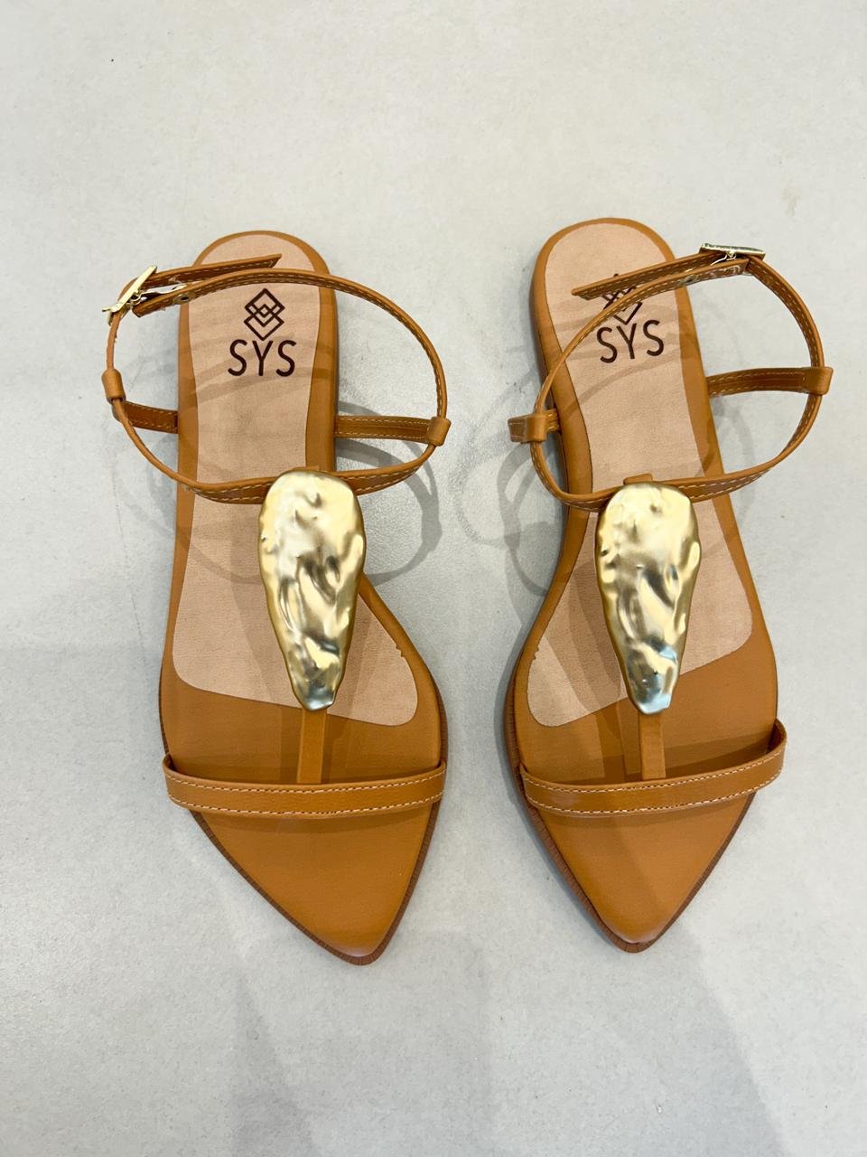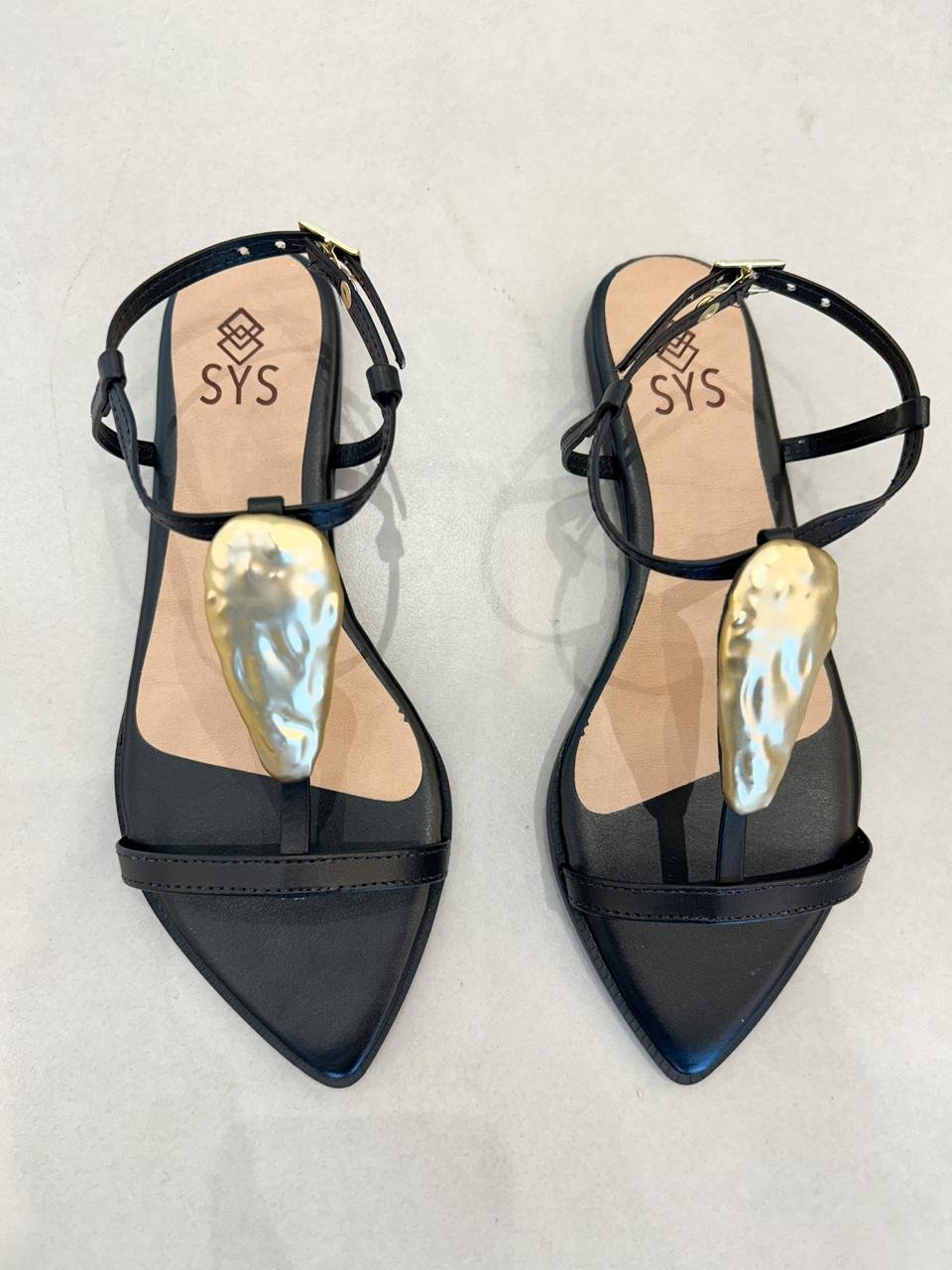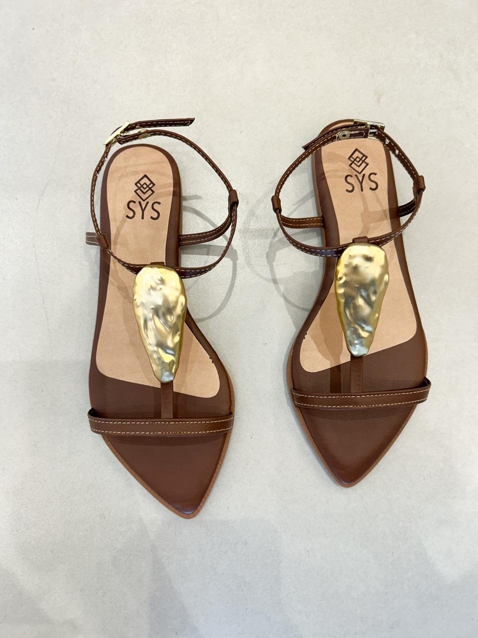 Esta sandália de salto rasteiro possui um detalhe orgânico dourado no cabedal, trazendo um toque único ao visual. Confortável e versátil, é a escolha perfeita para complementar looks sofisticados