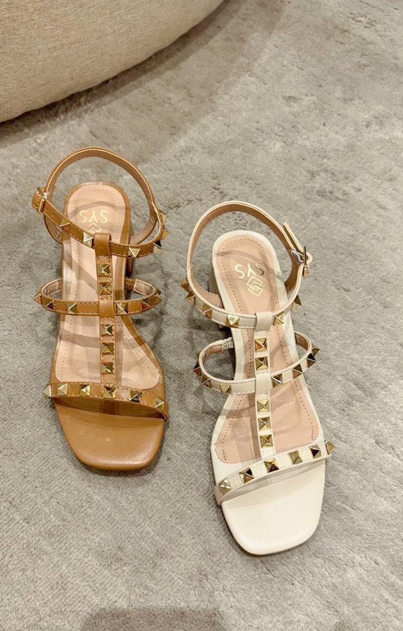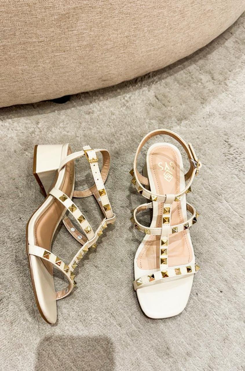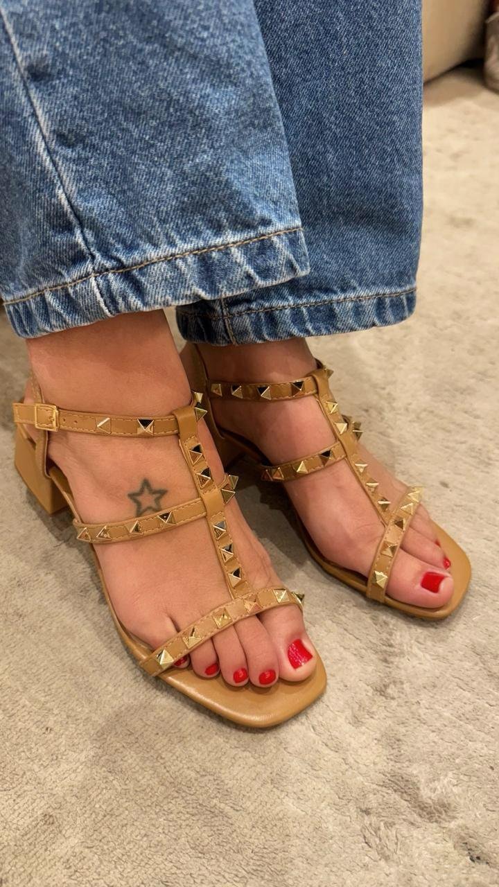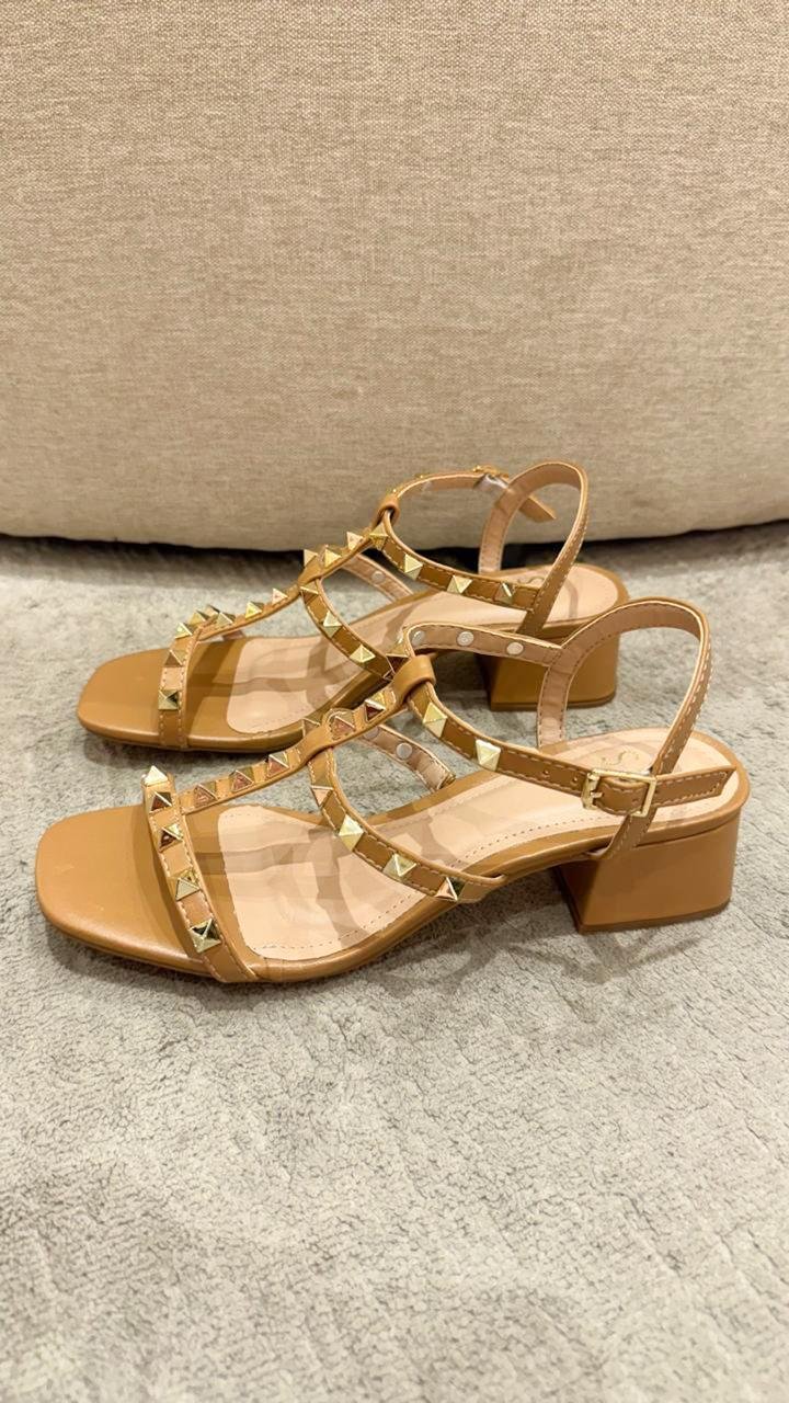 Sandália salto bloco médio, com detalhes em tachas no cabedal, moderna e confortável, ideal para ambientes despojados ou casuais
