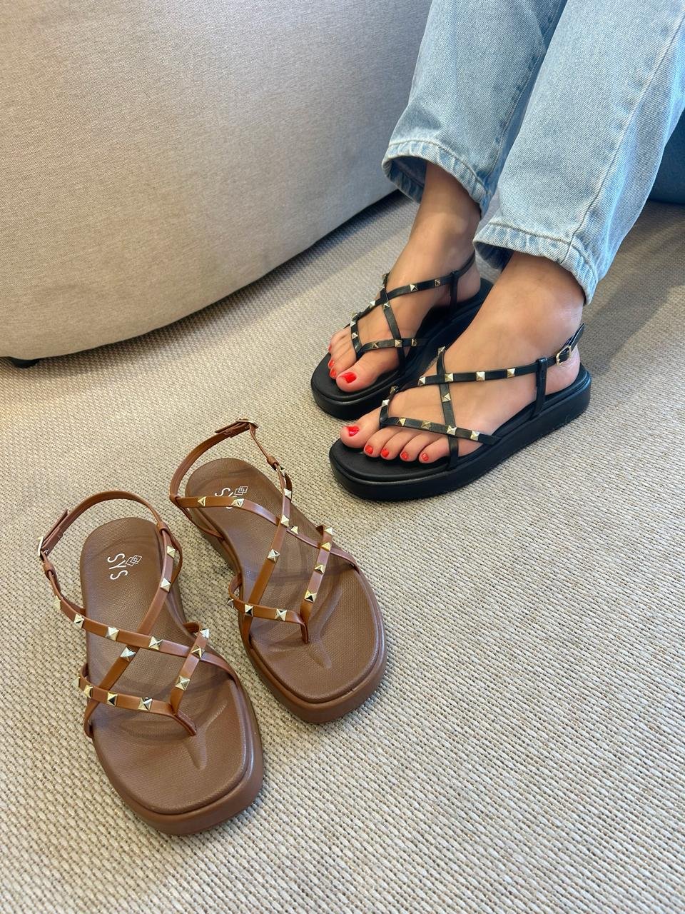 Essa sandália tem um design super moderno e elegante, perfeita para quem busca estilo e conforto, com tiras finas que cruzam os pés, adornadas com pequenas tachinhas douradas dando aquele charme para seu visual!