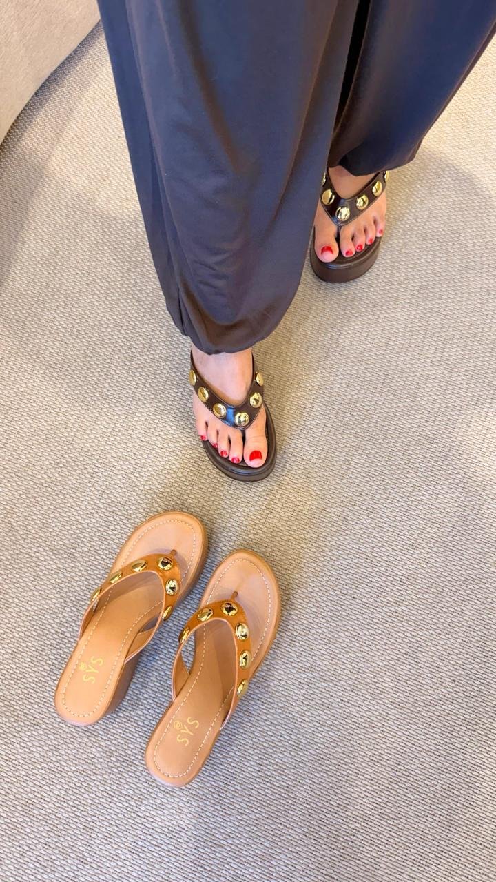 Tamanco salto plataforma clássico e sofisticado, ideal para eventos casuais, possui e, tachas douradas no cabedal, uma ótima escolha para o verão!
